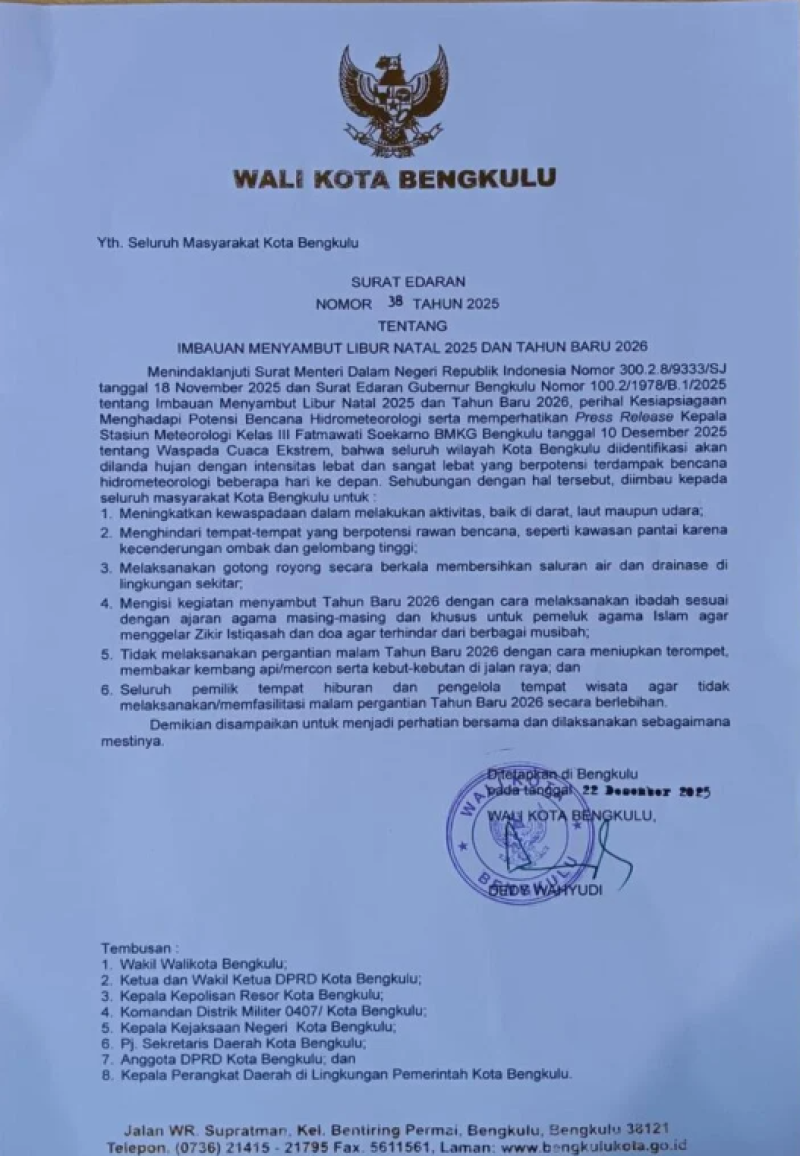 BENGKULU.WAHANANEWS.CO, Kota Bengkulu – Pemerintah Kota Bengkulu mengeluarkan surat edaran berisi imbauan kepada masyarakat agar merayakan malam pergantian tahun secara bijak, aman, dan tidak berlebihan.