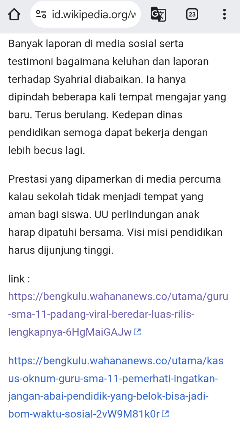 Pantauan WahanaNews, sejumlah pengguna Wikipedia menambahkan tautan referensi berita daring yang berkaitan dengan peristiwa yang terjadi pada Senin (15/12/2025), sebagaimana tercantum pada bagian referensi halaman sekolah itu. Salah satu tautan yang dicantumkan mengarah pada pemberitaan media daring yang memuat keterangan pengakuan oknum guru SMAN 11 Padang berinisial S (58) saat diperiksa petugas.